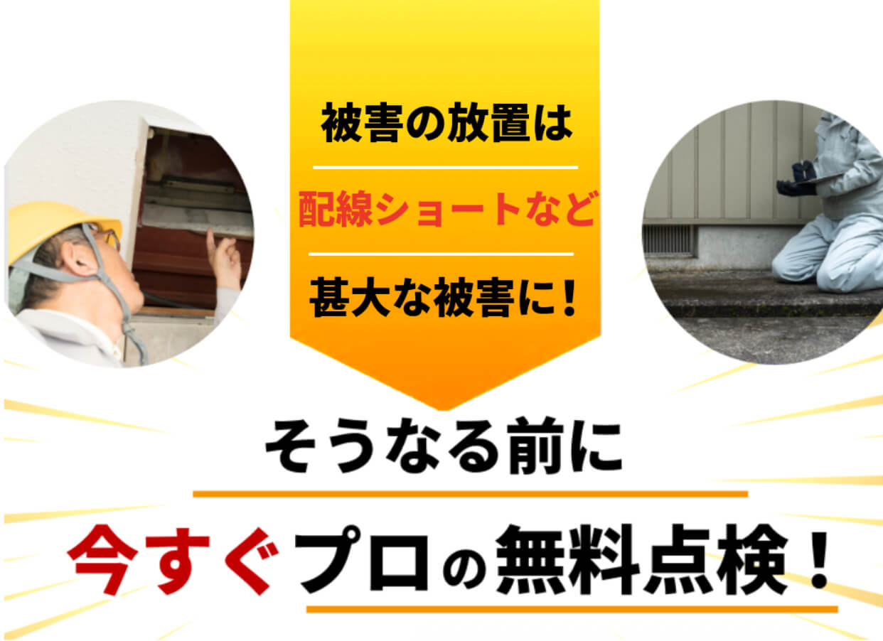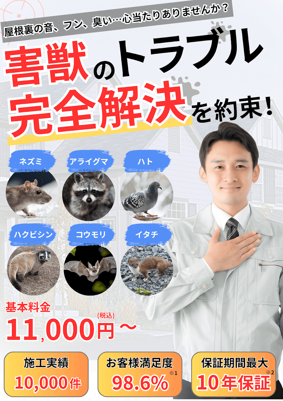 被害状況で大きく変動します。 根本的な解決には駆除・閉塞・清掃のセットが必要となり、平均費用は20万円〜30万円前後となります。費用を抑えた応急処置は11,000円〜承りますが、再発リスクは高くなります。