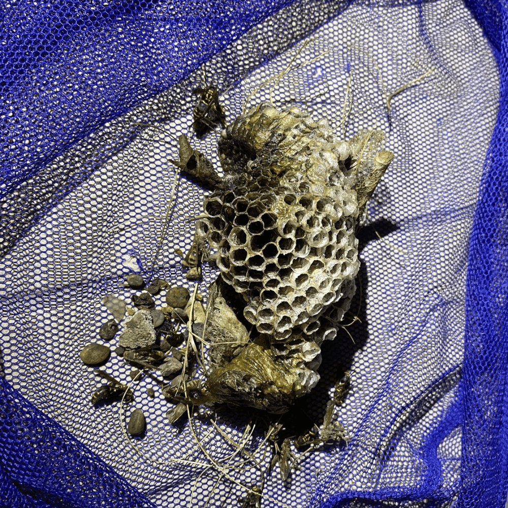 防護服を着用し、周囲の安全を確保した上で特殊薬剤を噴霧。攻撃的な約50匹の個体を一気に鎮圧し、巣を撤去しました。